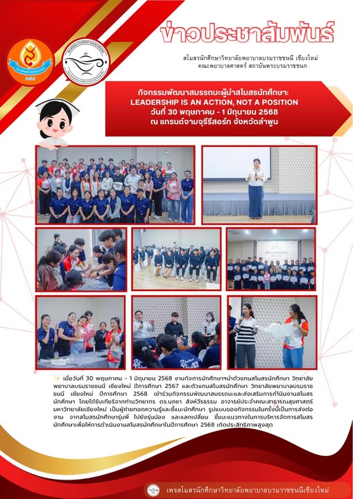 ✨ เมื่อวันที่ 30 พฤษภาคม - 1 มิถุนายน 2568 งานกิจการนักศึกษาฯนำตัวแทนสโมสรนักศึกษา วิทยาลัยพยาบาลบรมราชชนนี เชียงใหม่ ปีการศึกษา 2567 และตัวแทนสโมสรนักศึกษา วิทยาลัยพยาบาลบรมราชชนนี เชียงใหม่ ปีการศึกษา 2568 เข้าร่วมกิจกรรมพัฒนาสมรรถนะและส่งเสริมการดำเนินงานสโมสรนักศึกษา โดยได้รับเกียรติจากท่านวิทยากร ดร.นภชา สิงห์วีรธรรม อาจารย์ประจำคณะสาธารณสุขศาสตร์ มหาวิทยาลัยเชียงใหม่ เป็นผู้ถ่ายทอดความรู้และชี้แนะนักศึกษา รูปแบบของกิจกรรมในครั้งนี้เป็นการส่งต่องาน จากสโมสรนักศึกษารุ่นพี่ ไปยังรุ่นน้อง และแลกเปลี่ยน ชี้แนะแนวทางในการบริหารจัดการสโมสรนักศึกษาเพื่อให้การดำเนินงานสโมสรนักศึกษาในปีการศึกษา 2568 เกิดประสิทธิภาพสูงสุด